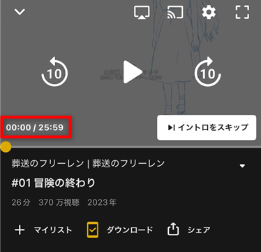 この時、再生時間の横にダウンロードアイコンがないと通常の再生(ダウンロード動画を再生していない)